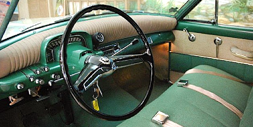 A symmetrical layout. I'm not sure what the small, round items on the right are ... not important gauges, I hope. The 1955 Chrysler Corporation line featured dash-mounted automatic transmission selectors. It's that short spike just to the right of the speedometer. Its spear-like aspect raised safety concerns, so for 1956 the Corporation's line went to pushbutton selectors.